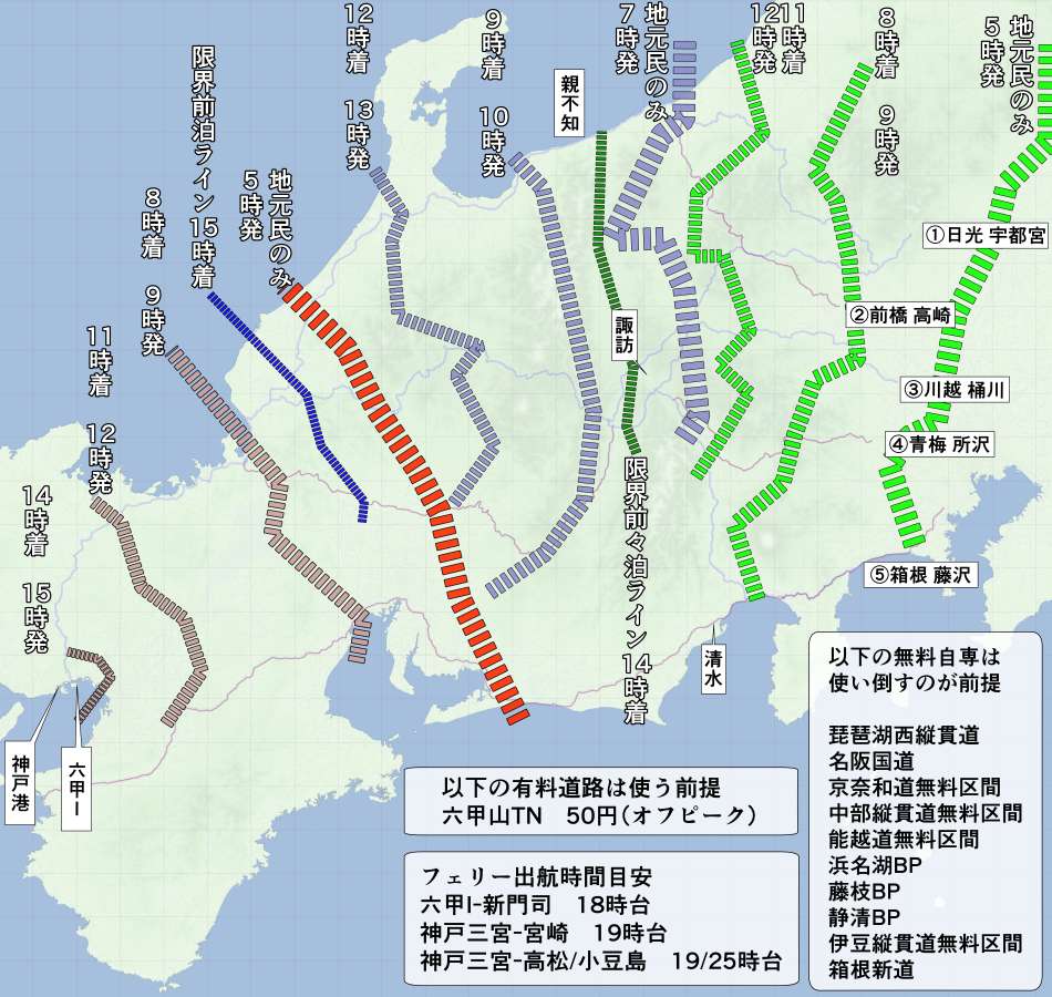 前回の東海道プランと同じ2日(1泊2日)で行ける範囲は、長野県民まで。けっこう考えたんだけど群馬はキツイ(まぁ、高速課金すれば1泊で可能、帰りなら0泊ギリ可能)。
